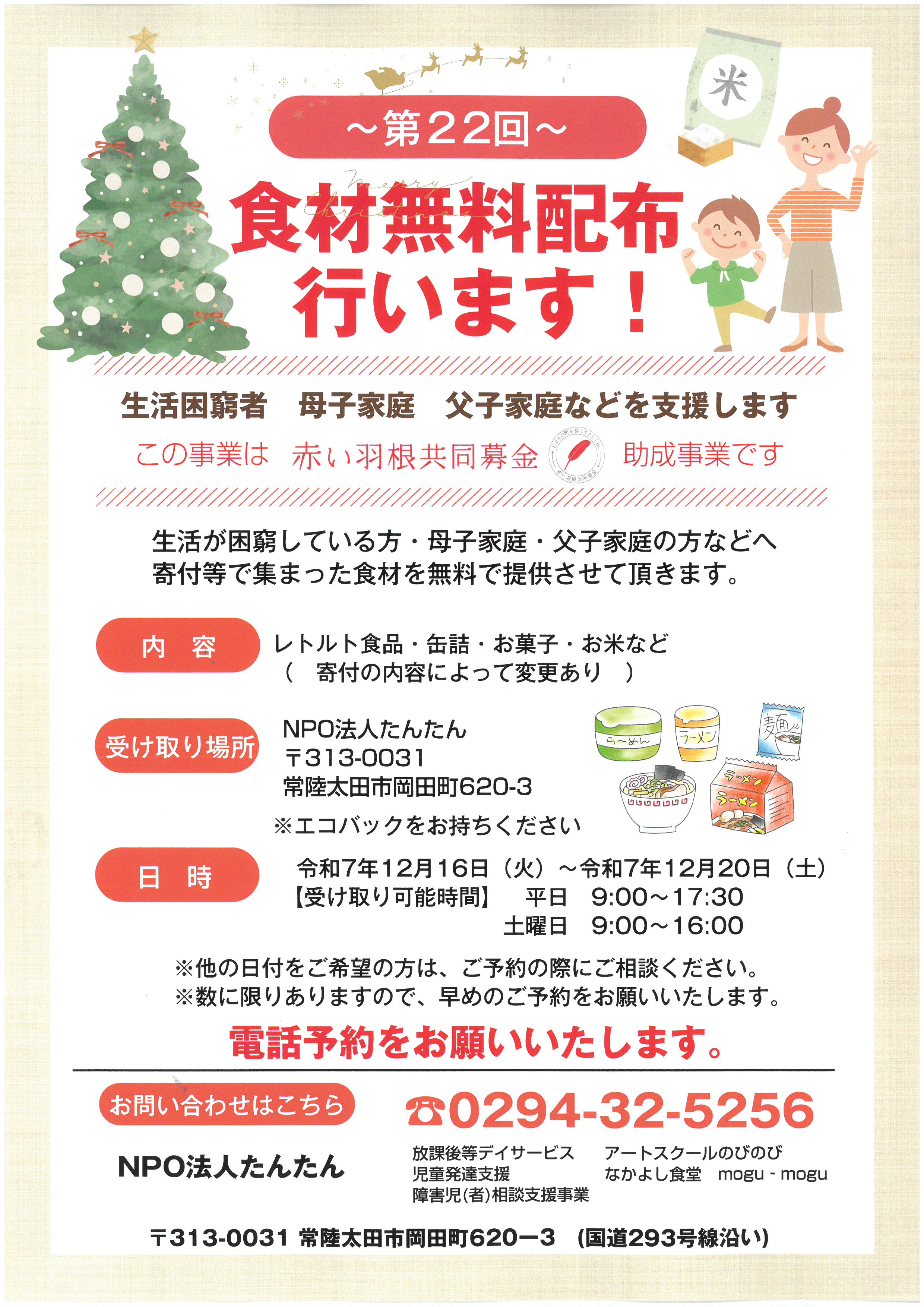 3月19(火)~3月23日(土)の日程にて食材無料配布を行います。併せて、3月20日(水・祝)に親子で参加できる
